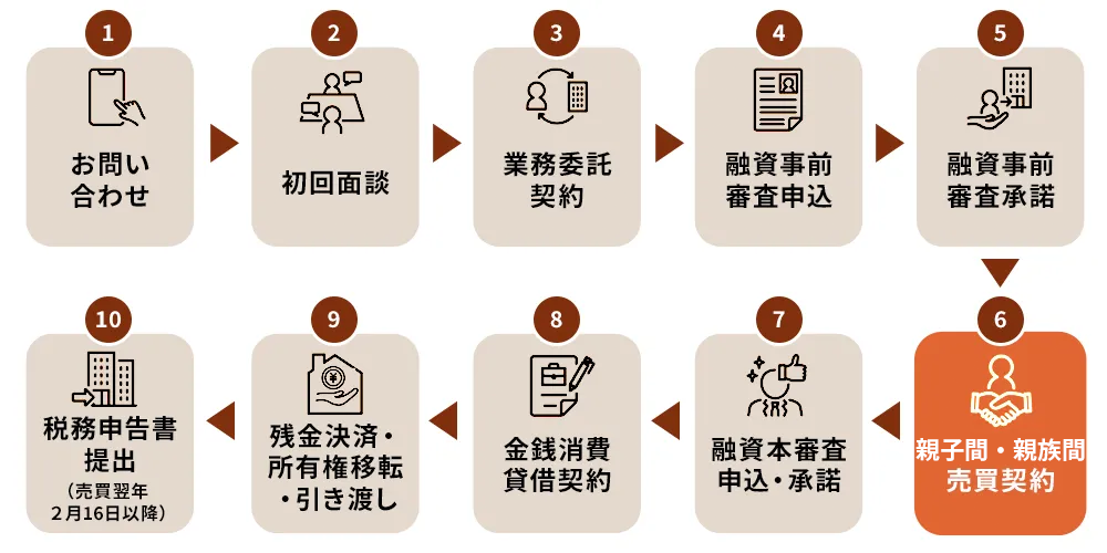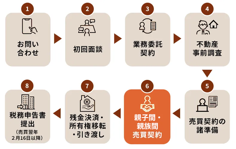 | 兄弟姉妹間 | 「使わなくなった自宅を兄弟に売りたい」「姉が相続した自宅を自分が買い受けたい」など、一般の売買と内容は似ているがたまたま相手が親子や親族だったというケース |