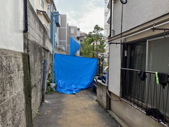なお擁壁の方はブルーシートがかけられておりよく確認できませんでしたが、隙間から見ると大きな崩壊の様相でした。過去の現地画像を見ると擁壁は膨らんでおり、かつ割れ目もあり地面の崩壊に耐え切れなかったのだと思いました。「いつ崩れてもしょうがない」という感じでした。
